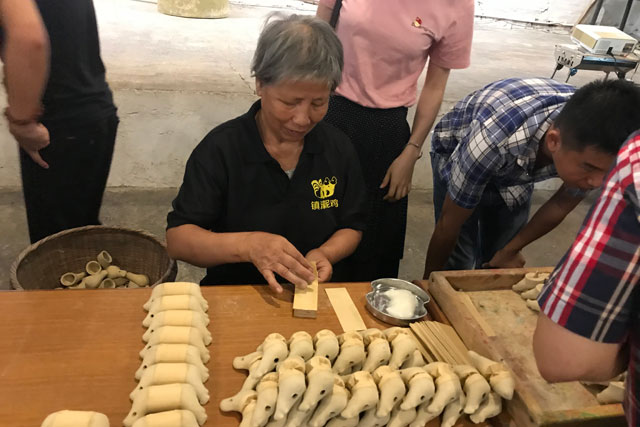 最后全體人員開車前往水口鎮(zhèn)聯(lián)竹村參觀開平非物質(zhì)文化鎮(zhèn)濠泥雞體驗展。