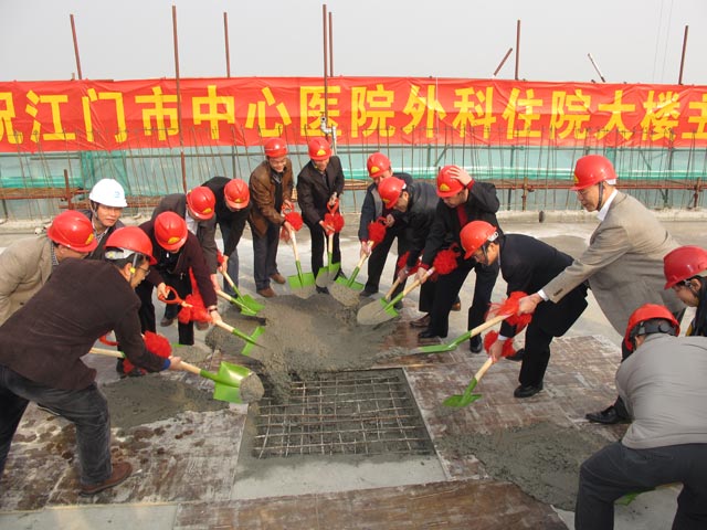 2014年1月6日上午11時,江門中心醫(yī)院外科住院大樓工程舉行封頂儀式,江門市衛(wèi)生局宋華局長、江門中心醫(yī)院梁伯進院長、我集團公司領(lǐng)導張國球、李甫、盧文權(quán)、張國勝出席了封頂儀式。江門市衛(wèi)生局宋華局長在工程現(xiàn)場會議室首先聽取了江門中心醫(yī)院外科住院大樓功能介紹和施工單位廣東金輝華集團有限公司對目前工程進度的簡單匯報,該工程地下2層,地上26層,建筑面積6.4萬平方米。隨后在江門中心醫(yī)院領(lǐng)導和施工單位負責