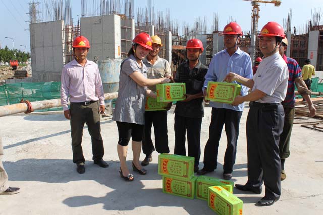 貫徹安監(jiān)總局辦公廳、衛(wèi)生部辦公廳、人力資源和社會保障部辦公廳、中華全國總工會辦公廳關(guān)于進(jìn)一步做好夏季防暑降溫工作的通知精神,保障我公司集團(tuán)員工在高溫天氣情況下安全順利的開展各項施工工作,公司黨委書記張解矛、工會副主席高迎春、行政中心副主任梁沛瑩、工程管理中心鄭國燦等同志于7月23日下午來到了金輝華綜合大樓施工現(xiàn)場,對一線施工人員在炎熱高溫環(huán)境下工作的情況進(jìn)行了親切的慰。