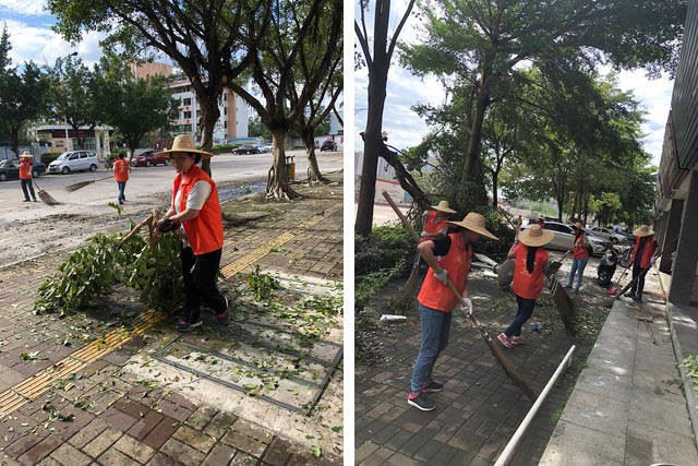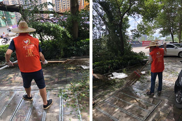在清理路障現(xiàn) 場,公司黨委書記張解矛帶領(lǐng)大家一起頂烈日冒酷暑,搬樹枝、掃殘葉、清廢物,將路面清理打掃干凈。