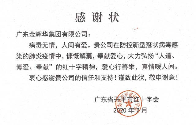 今年春節(jié),一場(chǎng)突如其來的新型冠狀病毒感染的肺炎疫情牽動(dòng)著每一個(gè)人的心,更牽動(dòng)著每一位金輝華人。新型冠狀病毒感染的肺炎疫情(簡(jiǎn)稱“疫情”)發(fā)生后,在習(xí)近平總書記:生命重于泰山,疫情就是命令,防控就是責(zé)任的指引下,并在開平市新冠肺炎疫情防控指揮部的統(tǒng)一部署下,開平市紅十字會(huì),慈善會(huì)共同發(fā)布了《開平市紅十字會(huì)、開平市慈善會(huì)關(guān)于募集我市疫情防控工作資金和物資的倡議書》。廣東金輝華集團(tuán)有限公司積極響應(yīng)、踴躍捐贈(zèng),體現(xiàn)了本公司“一方有難、八方支援、同舟共濟(jì)”的優(yōu)良傳統(tǒng)。2020年2月3日,公司定向捐贈(zèng)長(zhǎng)沙街道辦事處10萬(wàn)元,開平市20萬(wàn)元,合計(jì)30萬(wàn)元用于新冠肺炎疫情防控。用自己的方式,傳遞著建筑人的溫度、溫情和專業(yè)力量,展現(xiàn)民營(yíng)企業(yè)的責(zé)任擔(dān)當(dāng),全力做好疫情防控工作,為開平的疫情防控全局作出了積極貢獻(xiàn)。
