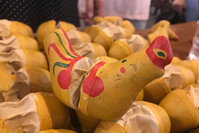 開平市水口鎮(zhèn)聯(lián)竹鄉(xiāng)制作鎮(zhèn)濠泥雞玩具已有二百多年歷史,以前每到農(nóng)歷春節(jié)前夕,來自鶴山、臺山、恩平、新會等地的商販們便駕車來采購泥雞作年貨銷售。泥雞外形古樸、價格便宜,深受人們的喜愛。大年初一是雞日,大量泥雞上市,一時泥雞啼聲四起,給人們帶來歡欣和喜氣。