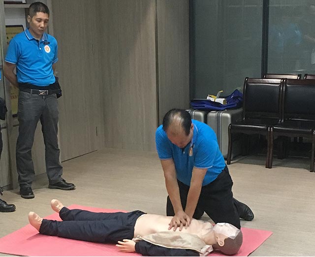 老師們現(xiàn)場為大家展示了開放氣道、胸外按壓、人工呼吸、復原體位等心肺復蘇術(shù)之后,讓在場的公司員工輪流親自動手實踐心肺復蘇、人工呼吸、外傷包扎等技能。大家熱情高漲,表現(xiàn)出了極大的學習興趣。